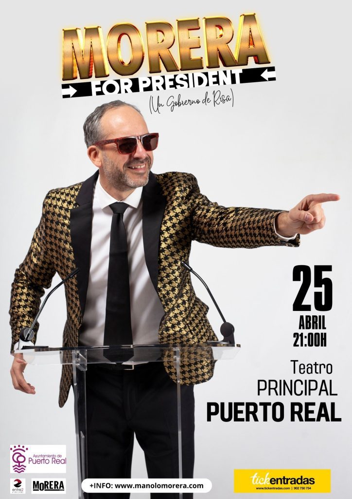 Morera for President es un espectáculo de humor protagonizado por el gaditano Manolo Morera. Tras el éxito de sus anteriores obras, «Me reí, león» (El Musimal) y «La vida es un cachondeo», Morera presenta este nuevo show en solitario, con guión, escenografía y vestuario originales.